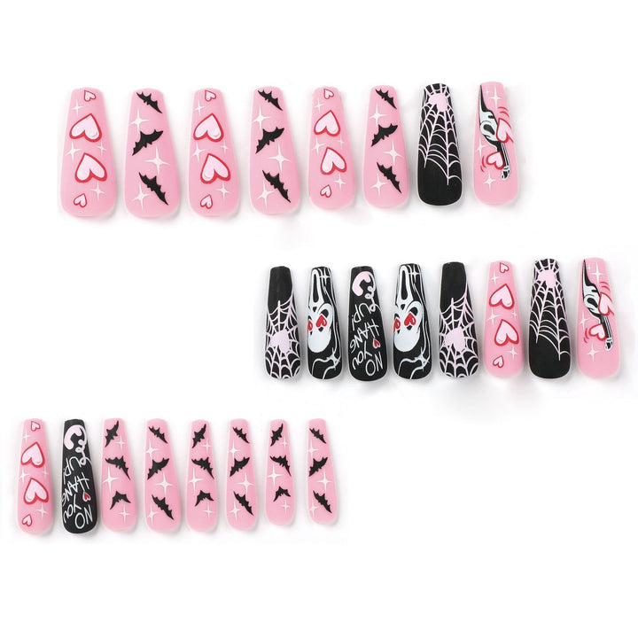 A unique and edgy nail design featuring soft pink tones contrasted with intricate web patterns. The playful mix of sweet and spooky creates a bold, stylish vibe. Perfect for those who love feminine colors with a daring, creative twist.